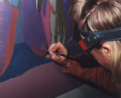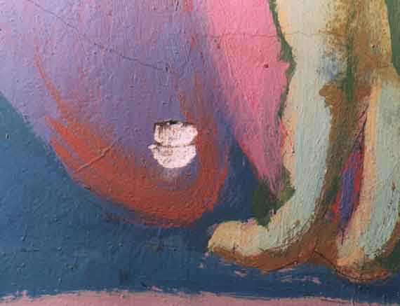 After the removal of the retouching we can see where cracks have been cut back in a previous restoration attempt... |