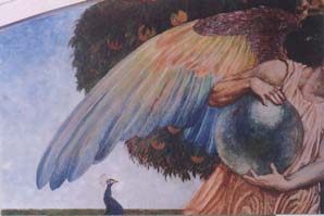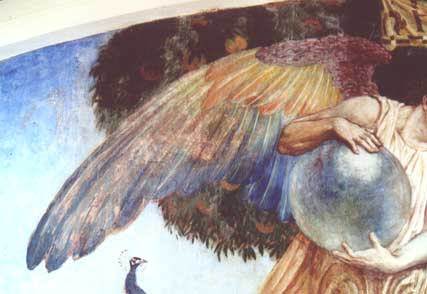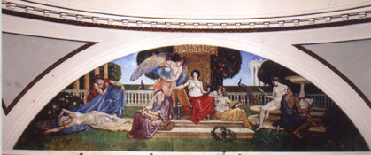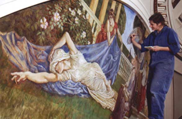 Carolyn Robinson carefully retouches an area of the Lunette where water has washed the paint from the canvas |
